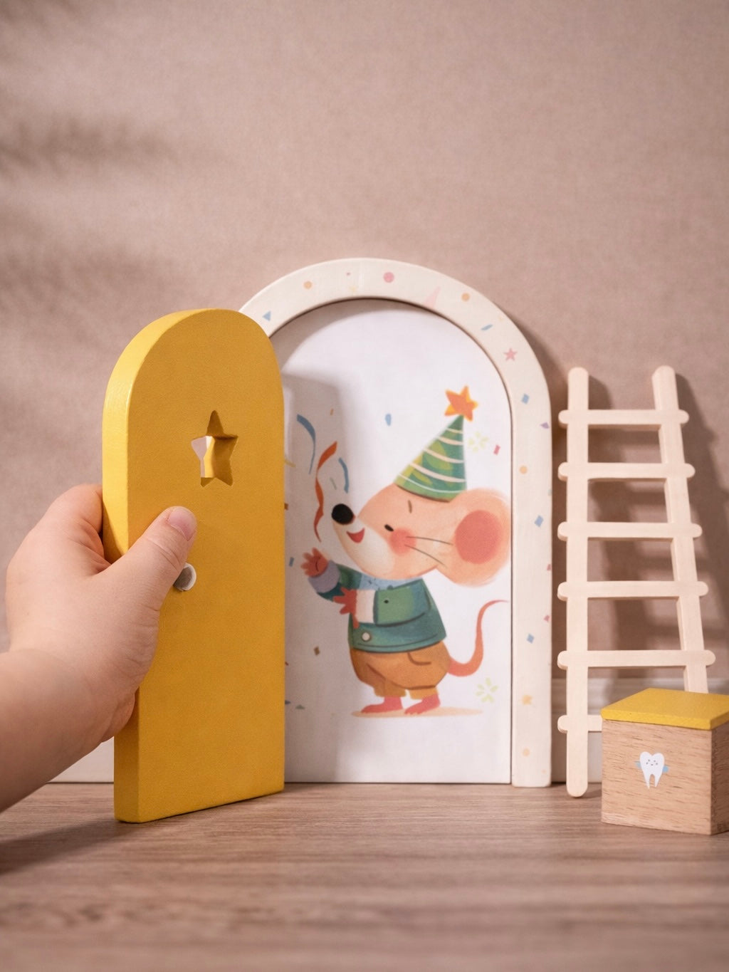 Dit gele deurtje bevat een lief muisje achter het deurtje en een laddertje die erbij geplaatst kan worden. Ook heeft deze set een lief klein brievenbusje waar post in bezorgd kan worden. Het deurtje en muisje kunnen gemakkelijk tegen de muur bevestigd worden met de meegeleverde dubbelzijdige tape. Er kan natuurlijk ook een ander plaatje naar eigen wens achter het deurtje bevestigd worden.